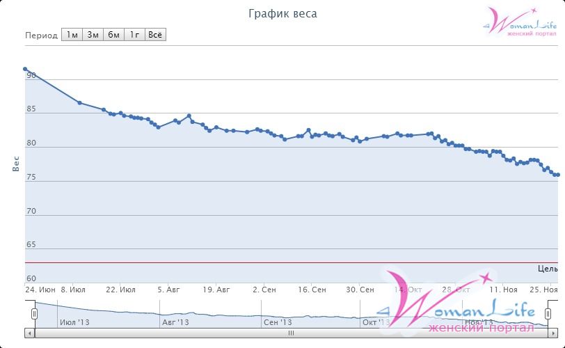 Мальвина, для идеального похудения вес должен колебаться, вот у меня к примеру сегодня -600, а вчерабыло +200, позавчера -300, за день до этого +100. Это нормально, линия снижения веса должна быть ломаной, но главное чтоб была общая тенденция снижения.