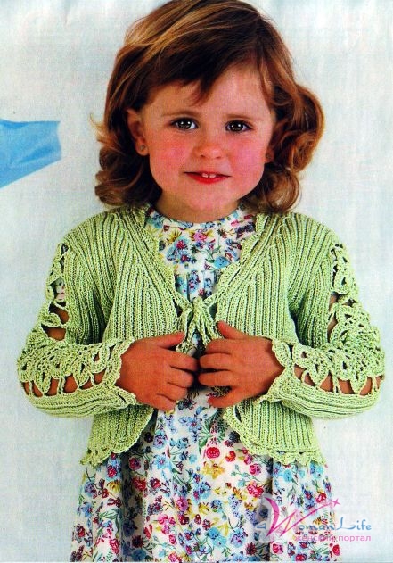 Для вязания кофточки потребуется: 300 г пряжи (100 % шерсть) бледно-зеленого цвета, крючок № 2,5 и спицы № 2,5.