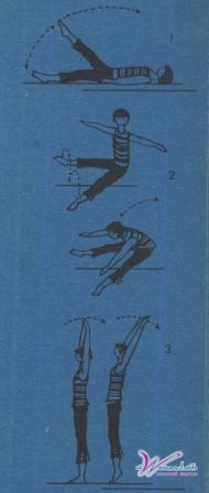2-е упражнение. Разведение ног в стороны и соединение их с одновременными наклонами туловища вперед. Исходное положение: сидя, выпрямленные ноги врозь, руки в стороны. Приподнимите ноги, сомкните их и, опустив, коснитесь пола. Затем снова поднимите, разведите и перейдите в исходное положение. Теперь наклоните туловище вперед, выпрямитесь. При наклонах руки должны касаться ног. В первую неделю можно выполнять упражнение, опираясь руками. В положении сидя и при наклонах вперед позвоночник остается прямым, ноги тоже выпрямлены.
