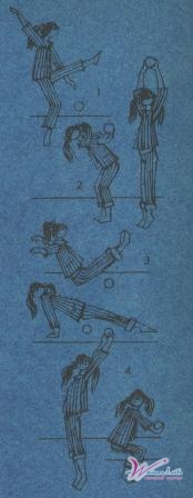 1-е упражнение. Пружинящие движения и прыжки на месте. Исходное положение: стойка на носках, руки вниз. Переместите вес тела на левую ногу и опустите пятку левой ноги на пол. Правая нога при этом остается впереди на носке. Вставая опять на носки, смените положение ног. Сделайте это упражнение четыре раза (по 2 каждой ногой), затем сделайте четыре прыжка на двух ногах. Пружинящие движения способствуют развитию гибкости, эластичности ступни. Прыжки требуют значительного усилия, крепких мышц. При подскоке ноги вместе. При опускании на пол делайте полуприсед.
