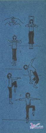 1-е упражнение. Движения руками со скакалкой в разных направлениях. Исходное положение: ноги вместе, руки вверх; сложенная вдвое скакалка удерживается обеими руками. Отведите выпрямленные руки вперед, затем вниз и снова вверх. Левую держите в положении вверх, правую опустите вниз. Затем поменяйте положение рук. Вернитесь в исходное положение. Теперь отведите выпрямленные руки назад (выкрутом в плече¬вых суставах), затем вниз и снова вверх. Продолжайте выполнять упражнение в той же последовательности. Если упражнение выполняется правильно, то можно попеременно стоять на всей ступне и на носках. В положении руки вверх рекомендуется каждый раз подниматься на носки.