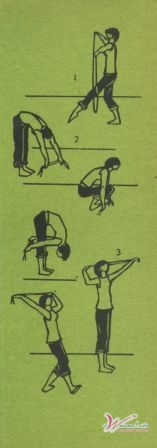 3-е упражнение. Круговые движения туловищем в седе ноги врозь и упор лежа сзади. Исходное положение: сед ноги врозь, руки вниз. Сделайте круговое движение туловищем справа налево, обопритесь обеими руками за собой и, поднимая таз, перейдите в упор лежа сзади, ноги врозь. Снова перейдите в сед ноги врозь, руки вниз, и делайте круговые движения туловищем в другую сторону. После перехода из упора лежа в сед ноги врозь руки для компенсации поднимаются через стороны вверх и снова опускаются.