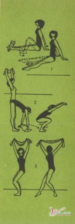 2-е упражнение. Наклоны туловища вперед со сгибанием и выпрямлением ног. Исходное положение: стойка туловище в низком наклоне вперед, руки вниз; сложенная вдвое скакалка удерживается обеими руками. Присядьте и приподнимите носки. Положите скакалку под ступнями и опустите носки. Затем поднимите пятки, не сгибая рук, отведите их (со скакалкой) за спиной вверх, выпрямляя при этом ноги. Выполните движения в обратной последовательности. Чтобы легко переносить тяжесть тела в приседе на пятки и носки, нужно хорошо владеть телом и укреплять ступни. Скакалка должна продеваться под ногами без задержки. В течение всего упражнения она туго натянута.