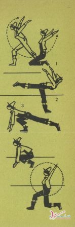 4-е упражнение. Дугообразный мах ногами. Исходное положение: стойка скрестно, опорная нога в полуприседе, другая вперед скрестно, руки за голову. Махом назад опишите дугу неопорной ногой и выпрямите при этом опорную. Выполните движения в обратной последовательности. Многократно повторив упражнение, начинайте его снова. Отведенные на затылок руки существенно затрудняют выполнение упражнения.