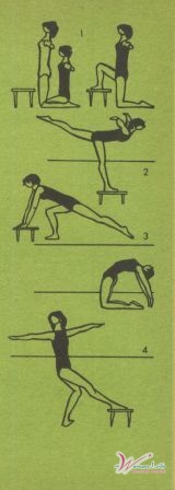 2-е упражнение. Фронтальное равновесие на скамейке. Исходное положение: стоя на скамейке, руки вниз. Вы уже выполняли фронтальное равновесие в субботу. Перенесите тяжесть тела на левую ногу и выполните равновесие так же, как и на полу. Затем смените опорную ногу. Если вначале трудно держать равновесие на скамейке, ее можно ставить поближе к стене.