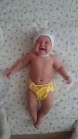 Не нравятся одевания ( ну, это с самого начала так было) памперсы, боди через голову, а особенно комбинезон!! Последний пришлось срочно заменить на новый. Очень быстро из него вырос!