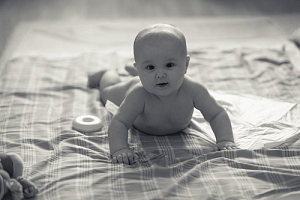 К концу 6-ти месяцев стал меньше истерить, больше играет и улыбается. На кровати уже оставлять опасно, стал и там переворачиваться, когда тянется за какой-то игрушкой или предметом.