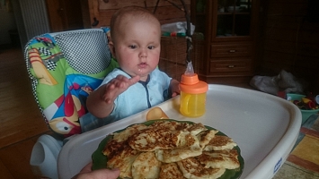 Появился интерес к еде, ест: кабачок, брокколи, цв.капусту, кашу гречневую( heinz). Даю пробовать банан, яблоко, картошку понемногу.