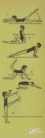 1-е упражнение. Попеременное поднимание и опускание ног в положении лежа на животе. Исходное положение: лежа на животе, руки вверх, одна прямая нога поднята вперед вверх. Опустите ногу и одновременно поднимите вторую. Продолжайте выполнять упражнение таким же образом, не кладя на пол обе ноги одновременно. Упражнение особенно эффективно при напряжении мускулатуры всего тела. Если утомитесь, можно отдохнуть, лежа на животе, и после короткой паузы продолжить упражнение.2-е упражнение. Сгибание и выпрямление ног в седе с выпрямленными ногами в сочетании с упором лежа сзади. Исходное положение: сед с выпрямленными ногами; руками слегка опираетесь о пол за телом. Согните ногу в колене и одновременно ступню, снова выпрямите ногу и ступню, повторите упражнение с другой ноги. Поднимая таз, перейдите в упор лежа сзади. Снова опуститесь, переходя тем самым в сед с выпрямленными ногами, и выполняйте упражнение сначала. Сгибание ступни сначала кажется непривычным, но укрепляет мышцы. Выполнять упражнение следует интенсивно. В упоре лежа голова образует с позвоночником прямую линию. Таз поднят.3-е упражнение. Маховые движения ногами назад кверху в упоре на коленях. Исходное положение: упор на коленях. Переместите таз назад и сядьте на пятки, не отрывая рук от пола. Голова находится между руками. Снова поднимитесь в упор на коленях, при этом с силой сделайте мах согнутой ногой кверху. Запрокиньте голову назад. Опустите ногу на колено и сразу же перенесите тяжесть тела назад, то есть перейдите в сед на пятках. Теперь сделайте мах кверху другой ногой. Таким же образом продолжайте упражнение. Маховые движения в упоре на коленях делаются быстро, с силой. Колено согнуто, но ступня выпрямлена.4-е упражнение. Круговые движения ступнями и кистями в положении стоя. Исходное положение: стойка на одной ноге, другая поднята вперед вверх, руки в стороны. Выполняйте одновременно круговые движения кистями и ступней поднятой ноги. После восьми кругов поменяйте направление и продолжайте упражнение другой ногой. Если вначале не удается выполнять круговые движения ступнями и кистями рук одновременно, можно делать это поочередно. Если способность держать равновесие и координация движений хорошо не отработаны, можно выполнять упражнение, держась свободной рукой за какую-либо опору.