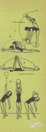 1-е упражнение. Перекатывание мяча вокруг ног в стойке ноги врозь. Исходное положение: стойка ноги врозь, туловище в наклоне вперед; мяч удерживается обеими руками на полу. Перекатите мяч вокруг ног восьмеркой. Выпрямитесь, поднимите мяч вверх и снова сделайте низкий наклон вперед, чтобы теперь перекатывать мяч в другую сторону. Набивной мяч должен быть не слишком большим. Перекатывайте его вокруг ног легко. Это удается в том случае, если мяч не ударяется о ноги.2-е упражнение. Поднимание и опускание туловища в положении лежа на животе в сочетании с подниманием мяча в разных направлениях и перекатыванием его. Исходное положение: лежа на животе, руки вверх; мяч удерживается обеими руками. Поднимите туловище, одновременно переводя мяч за голову; отпустите мяч, чтобы он покатился по спине. Быстро вытяните руки, чтобы поймать мяч; опустите туловище и перекатите мяч по полу в исходное положение. Нельзя задерживать мяч при качении в положении руки за головой. Чем выше поднимается туловище, тем быстрее катится мяч.3-е упражнение. Поднимание и опускание обеих ног с мячом в положении лежа на спине. Исходное положение: лежа на спине, руки вверх; ступни удерживают мяч. Поднимайте выпрямленные руки и ноги, пока не дотянетесь ладонями до мяча. Возьмите мяч в руки и одновременно опустите ноги и руки на пол. Повторите эти движения в той же последовательности, передавая мяч из рук на ступни и принимая тем самым исходное положение. Повернитесь на левый бок без помощи рук и ног. Повернитесь на спину, а затем на правый бок и снова на спину. Выполняйте упражнение сначала. При выпрямлении в сед можно зажать мяч ступнями или ногами выше щиколоток. Ноги и туловище поднимаются энергично, а опускаются медленно.4-е упражнение. Подбрасывание мяча рывком вверх с наклонами туловища в стороны. Исходное положение: стойка ноги вместе; мяч удерживается обеими руками перед грудью. Положите мяч на ладонь правой руки и сделайте полуприсед. Выпрямитесь и подбросьте мяч вверх так, чтобы он оторвался от ладони. Поймайте мяч, сгибая руку в локте и пружиня в коленях. Выполните упражнение левой рукой. Затем положите мяч на правое плечо, сделайте шаг вправо и низко наклонитесь в левую сторону. Повторите, наклоняясь в правую сторону. Мяч подбрасывается и ловится в сочетании с выпрямлением и сгибанием рук и ног. Если вначале мяч отрывается от ладони только на долю секунды, то следует постепенно увеличить высоту толчка.