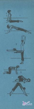 1-е упражнение. Поднимание и опускание плеч в упоре лежа. Исходное положение: сед с выпрямленными ногами; руки упираются в пол параллельно туловищу. Потяните одновременно оба плеча кверху и опустите. Отведите руки назад и обопритесь о пол на ширине плеч. Перейдите в упор лежа. Снова опуститесь в сед с выпрямленными ногами. Выполняйте упражнение. В седе с выпрямленными ногами всегда следует контролировать осанку: прямая спина, оттянутые вниз плечи, сильно напряженные мышцы брюшного пресса и выпрямленные ноги.2-е упражнение. Наклоны туловища вперед с вращением рук. Исходное положение: стойка ноги вместе, руки вниз. Поднимите руки через стороны вверх, соедините кисти и переплетите пальцы, поворачивая при этом ладони кверху. Наклоните туловище вперед до горизонтального положения, спина прямая. Обратным движением вернитесь в исходное положение. Повторяйте упражнение. Поднятые руки касаются головы за ушами. Это положение нельзя менять и при наклонах туловища вперед. Упражнение можно выполнять перед столом. В этом случае столешница поможет четко зафиксировать горизонтальное положение.3-е упражнение. В упоре на коленях наклоны туловища вперед и переход в упор стоя. Исходное положение: упор на коленях. Поверните голову в сторону и сгибайте руки, пока не коснетесь пола ухом. Находясь в этой позе, выпрямляйте руки и отводите их в стороны, прижимая одновременно плечи к полу. Снова обопритесь руками о пол и вернитесь в исходное положение. Теперь, выпрямляя ноги, поднимите таз, переходя таким образом в упор стоя. Опуститесь снова в упор на коленях. Повторяйте упражнение. Опускаться вперед легче, если перед этим вы отведете таз назад. Мышцы ног и спины должны быть напряжены. Однако основная тяжесть тела падает на руки или плечи. В упоре ноги могут по-прежнему опираться на носки. Воздействие упражнения более эффективно, если тяжесть тела действует на подъем ступни.